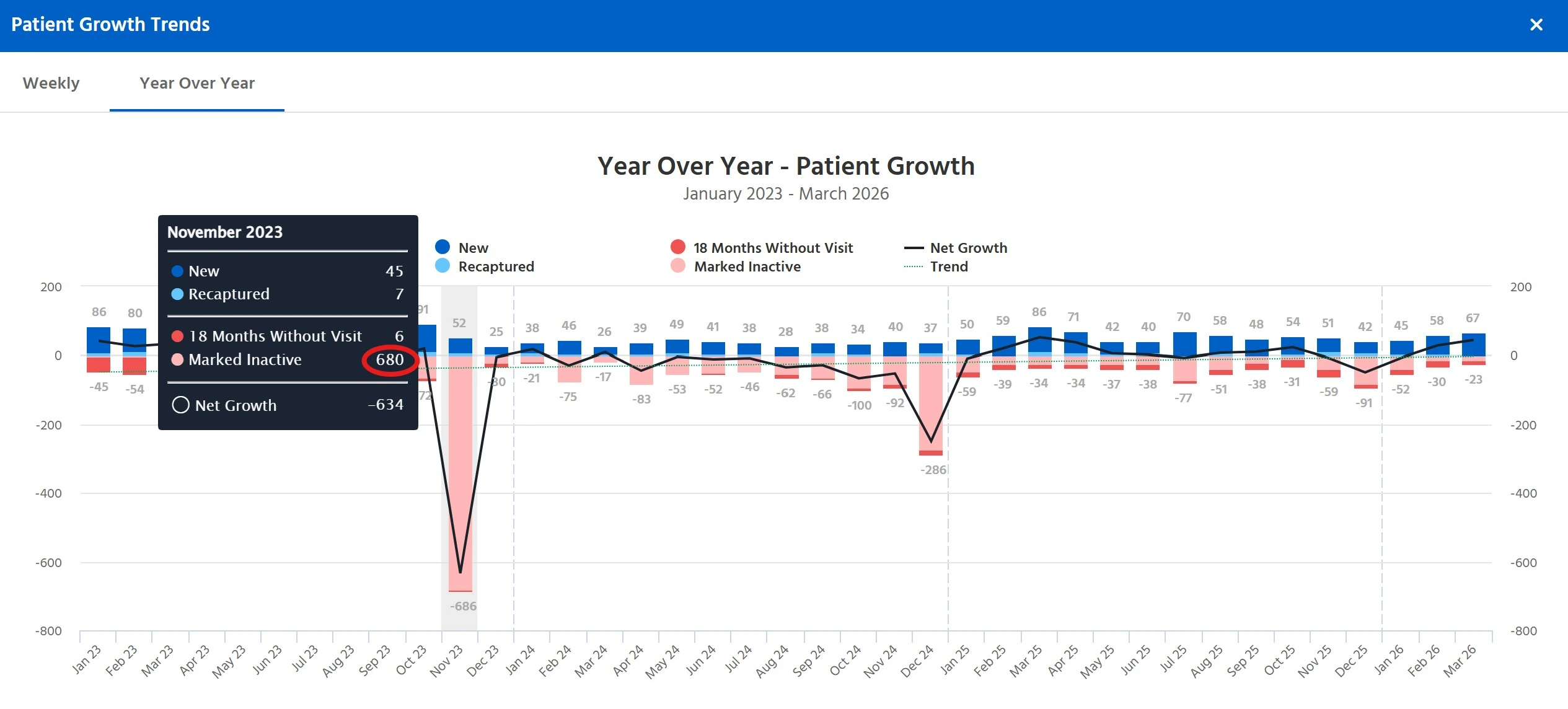 Screenshot from Dental Intelligence Showing an Intentional Drop of 680 Patients.